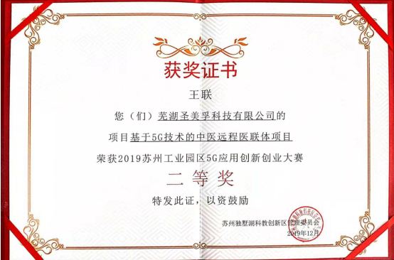 蕪湖圣美孚科技公司以“基于5G技術(shù)的中醫(yī)遠程醫(yī)聯(lián)體項目”參加此次大賽,與參賽的各種人工智能、大數(shù)據(jù)和物聯(lián)網(wǎng)等5G示范應(yīng)用場景的高新科技項目同臺亮相,于決賽現(xiàn)場進行了路演,闡述了基于5G技術(shù)的中醫(yī)遠程醫(yī)聯(lián)體項目成果并接受大賽評委的評審問答,經(jīng)過一番角逐,我公司參賽的“基于5G技術(shù)的中醫(yī)遠程醫(yī)聯(lián)體項目”榮獲2019年蘇州工業(yè)園區(qū)5G應(yīng)用創(chuàng)新創(chuàng)業(yè)大賽二等獎。
